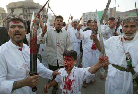 This was part of a recent Shiite celebration in southern Iraq, the first in 30 years because Saddam did not permit the free exercise of the Shiite version of Islam. I claim no understanding of it. The red stuff is not ketchup. How old do you think the little boy is?