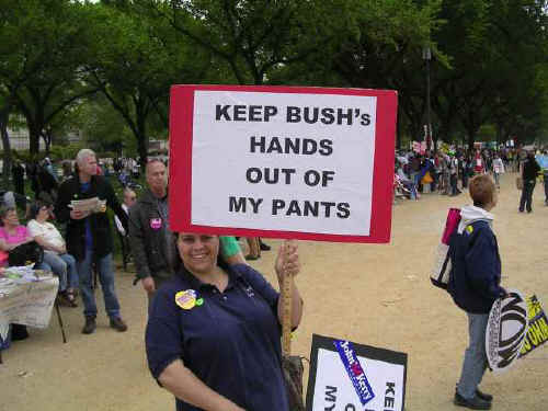 I regret to inform this damsel that Mr. Bush would never consider doing such a thing as that which so animates the sign-carrying obesity. And neither would any other man, dead or alive. She can rest easy and be assured that there is no male on the planet who would put her in such a condition that an abortion would get her out of it. The very thought of such a thing turns the stomach. The charming creature can relax---and have another milk shake. (Oh...any doubt about to which political party the thing belongs?)
