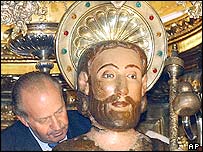 Once these Spaniards start surrendering, there is no stopping them! Saint James---Santiago---is a Spanish hero. Seldom was there a conquistador who did not rush into battle with the cry, "Santiago and at them!" on his lips. But old Santiago has fallen on hard times: Cathedral authorities in the pilgrim city of Santiago de Compostela recently ordered the removal of a statue of the saint. Why? Well, it seems one of the nicknames of the guy is 'Moor Slayer.' Truth be told, James was well-known as a killer of Moslems. The statue in question has the good saint slicing the heads of all sorts of them. (Boy, I would like to see Santiago doing likewise in Fallujah!) It seems said authorities want to avoid giving offence to any followers of Allah living in the area. Good idea! Why, if any Moslem got offended he might just blow up a train or something!